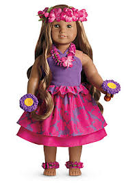 I really think she is a beautiful doll, and so different from anything AG's made before or after her. I absolutely LOVE her long curls! Her sandals are cute and a very pretty color. The dress I could probably make myself, but I like it nonetheless. And the hair clip and necklace are nice touches. My only problem is the HAZEL EYES! Aside from the fact that hazel is so WAY overdone, in the books it says she has dark eyes. Hazel is not dark, at least not in my world.